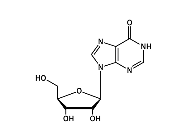 肌苷(Inosine),也稱為次黃苷、次黃嘌呤核苷等,是由次黃嘌呤與核糖結合而成的核苷類化合物。在嘌呤的從頭合成(de novo synthesis)中,肌苷酸(IMP)可以作為合成腺苷酸(AMP)和鳥苷酸(GMP)的前體。